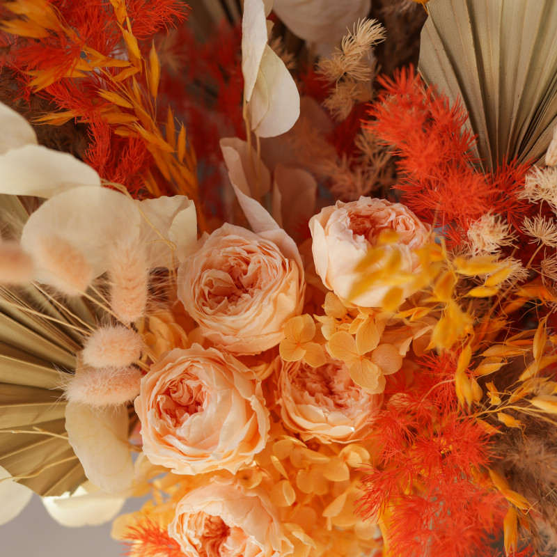 арт. 6112Пудрово-оранжевая настольная композиция, которая притягивает взгляд теплом и фактурой. Пышные пионовидные розы, яркая гортензия и деликатный микс сухоцветов создают атмосферу уюта и мягкой элегантности. Гранёная дизайнерская ваза добавляет ощущение продуманного стиля и завершённости.