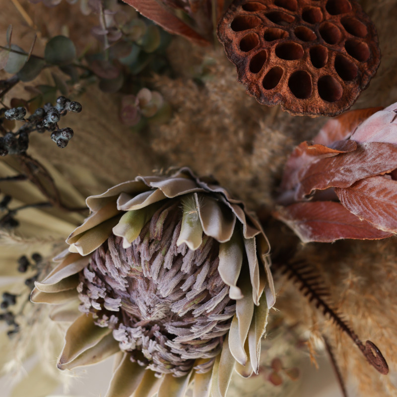 Яркая экзотическая композиция из стабилизированных сухоцветов с протеей