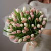 Монобукет свежайших хрустящих тюльпанов. Бережно упакован в дизайнерскую бумагу и декорирован длинными лентами.