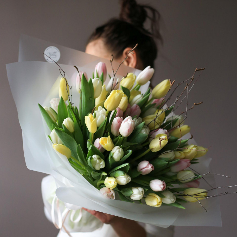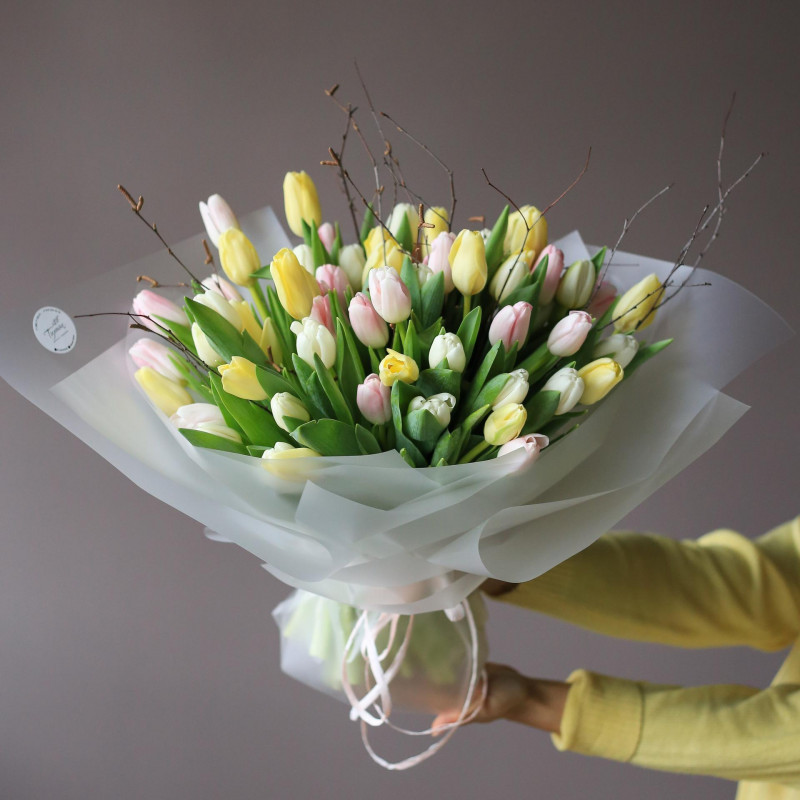 Пожалуй, более весеннего букета вы не найдете! Нежный микс пастельных тюльпанов подарит невероятное весеннее настроение.