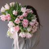 Монобукет пионовидных тюльпанов. Декорирован длинными лентами.
