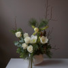 Авторский букет с белыми амариллисами, белыми розами ветками настоящей живой хвои, эвкалиптом и настоящими шишками — это отличный способ подарить что-то по-настоящему уникальное. Букет продается в комплекте с керамическом кашпо с рифленой текстурой.