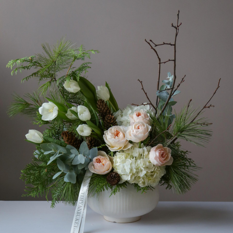 Авторский букет с белыми гортензиями, белыми тюльпанами, пионовидными розами сорта Джульетта, ветками настоящей живой хвои, эвкалиптом и настоящими шишками — это отличный способ подарить что-то по-настоящему уникальное. Букет продается в комплекте с керамическом кашпо с рифленой текстурой.