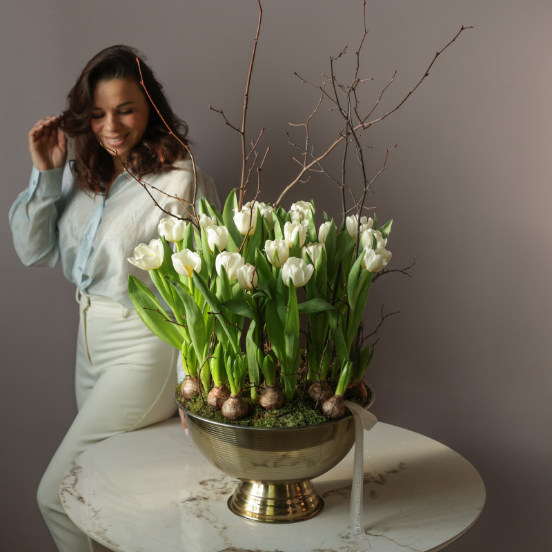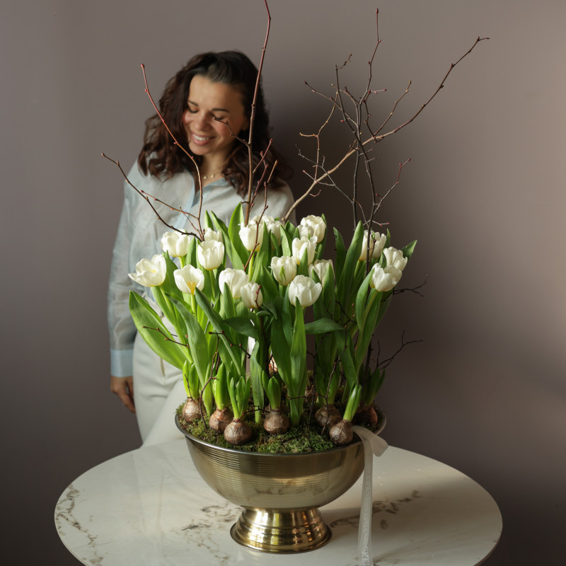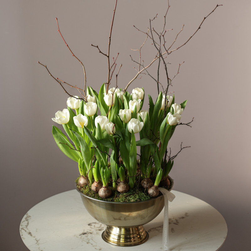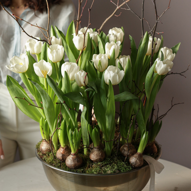 Объёмная весенняя композиция в металлическом кашпо, где белые тюльпаны сочетаются с ароматными луковичными гиацинтами, а декоративные ветки добавляют структуру и динамику. Лёгкая и выразительная, она создаёт ощущение свежести и естественной гармонии.
