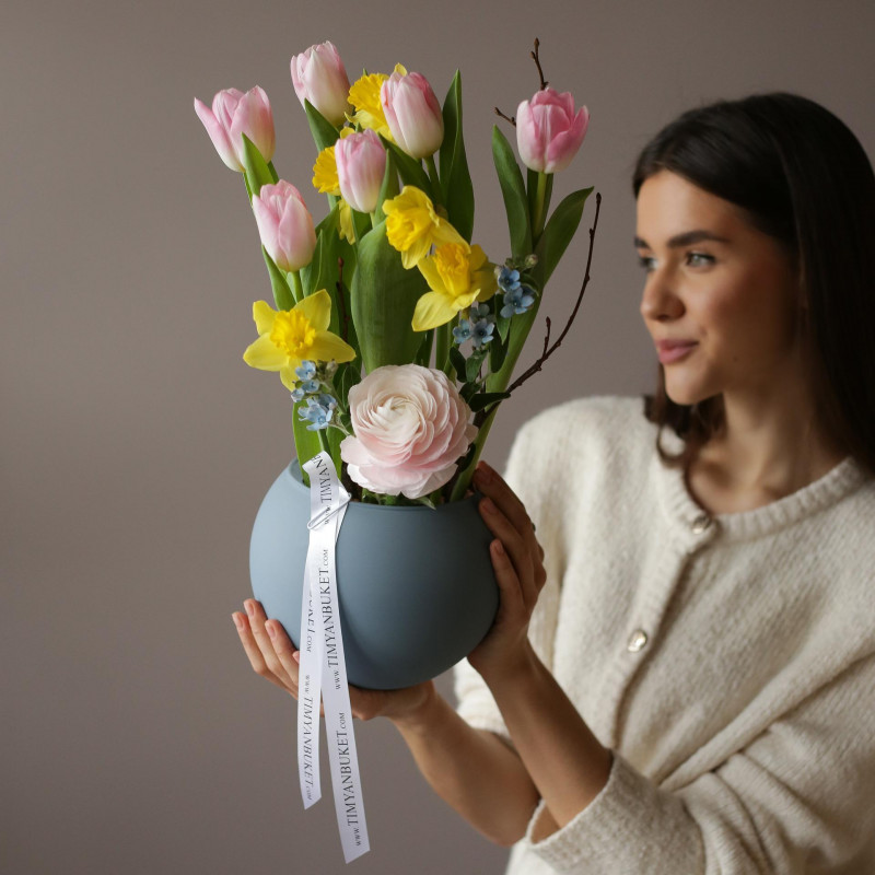 Авторская композиция из весенних цветов в дизайнерской вазе! Декорирована лентой.
