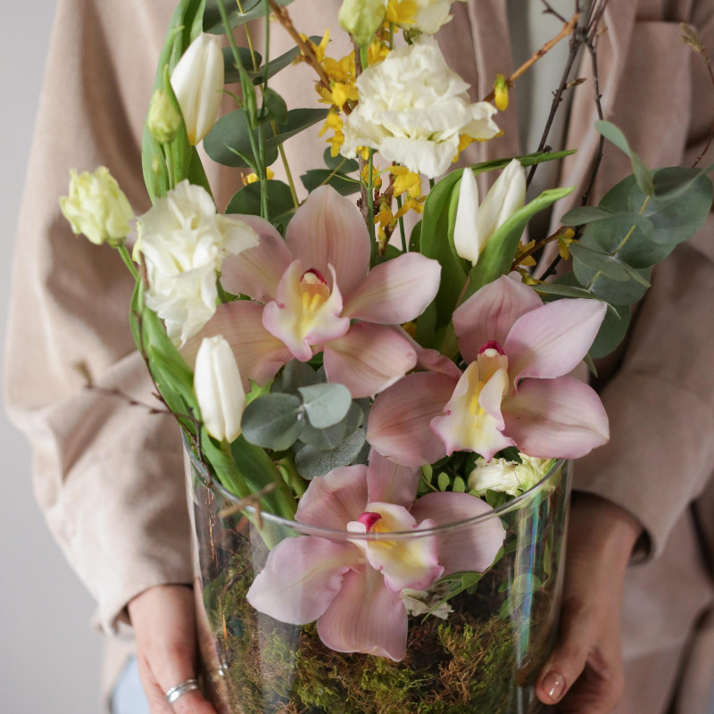 Авторская композиция из весенних цветов в дизайнерской вазе! Декорирована длинной брендированной лентой.