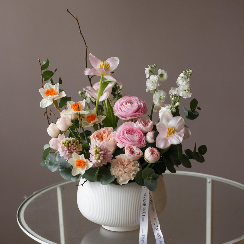 Авторская композиция из весенних цветов в дизайнерской вазе! Декорирована лентой.