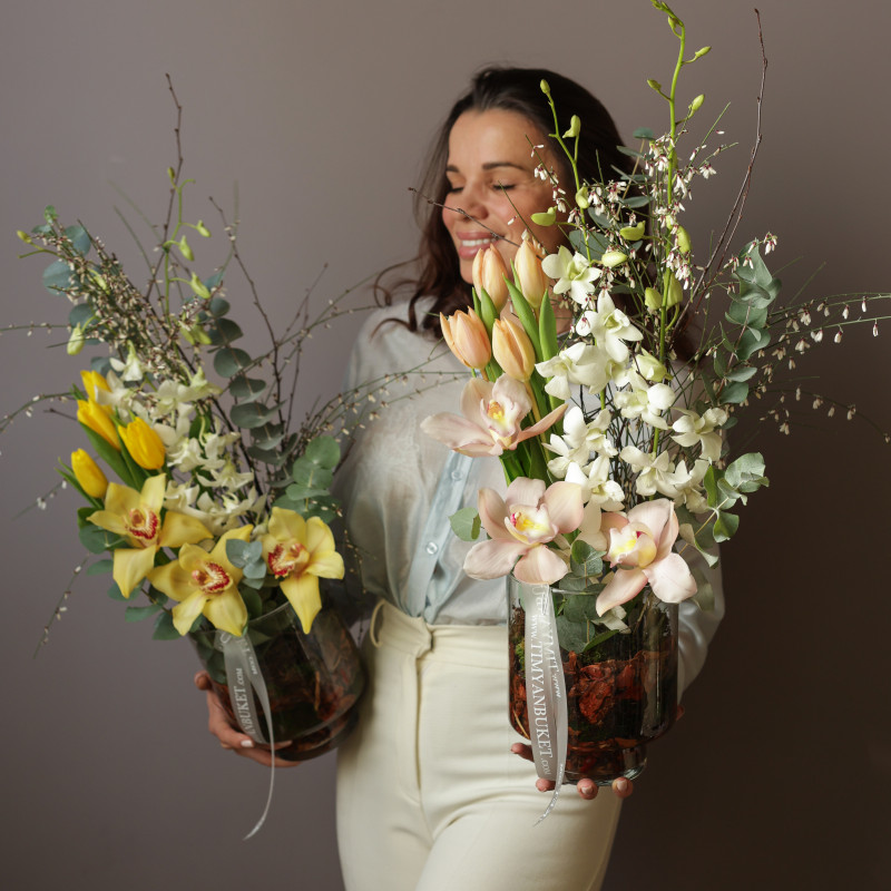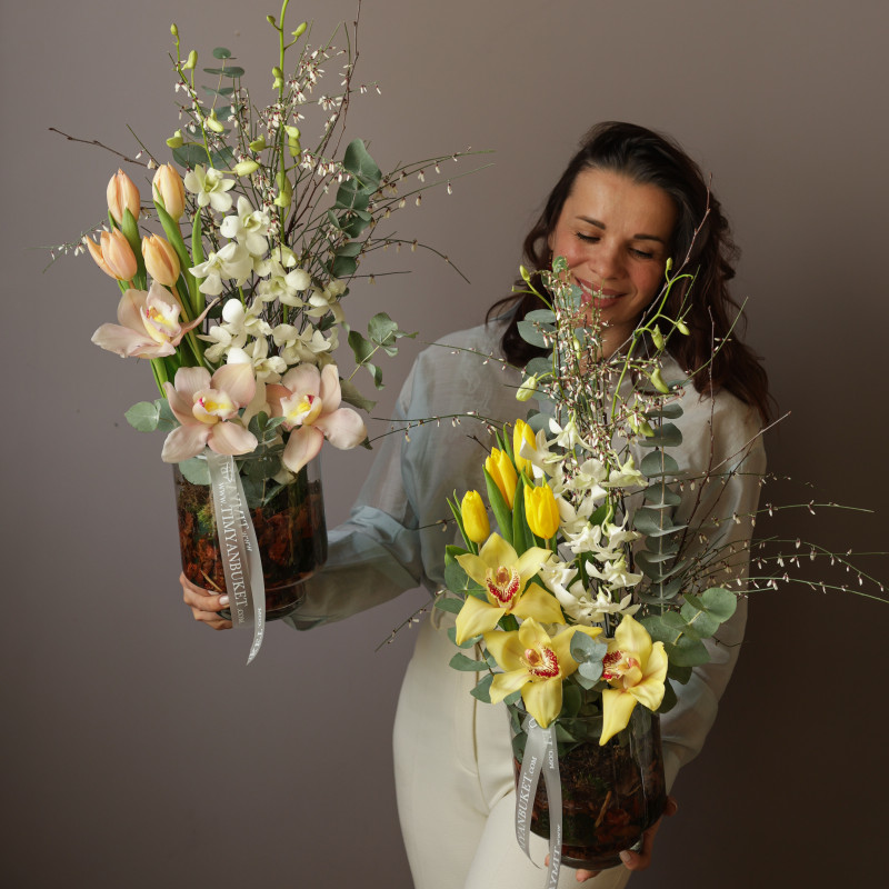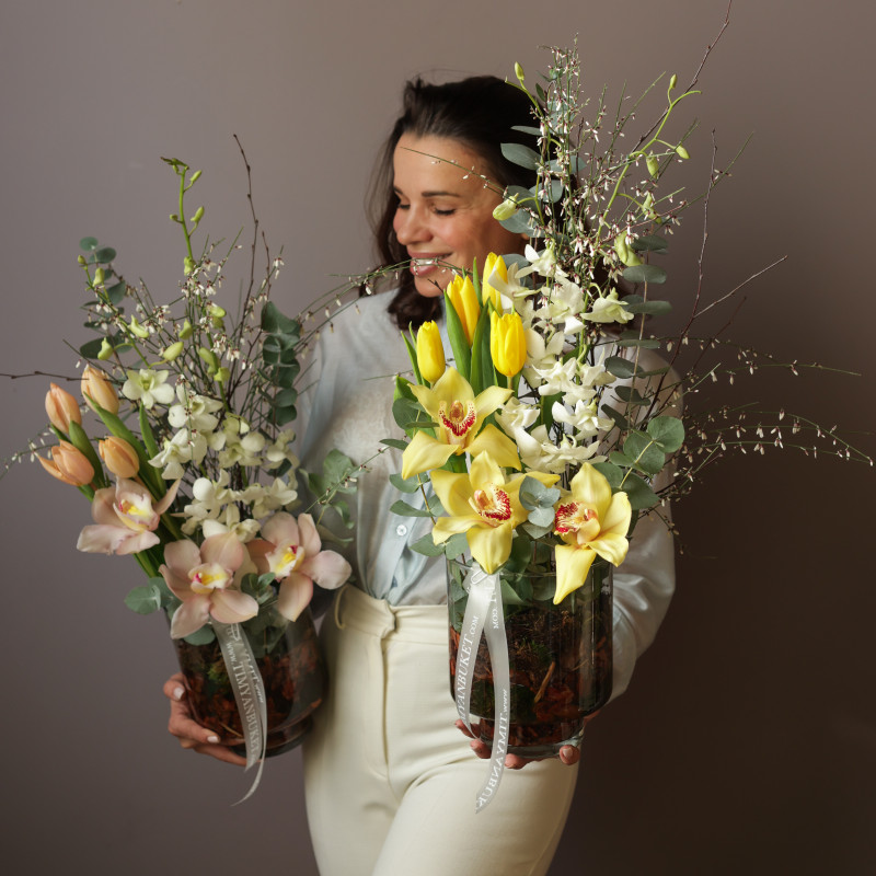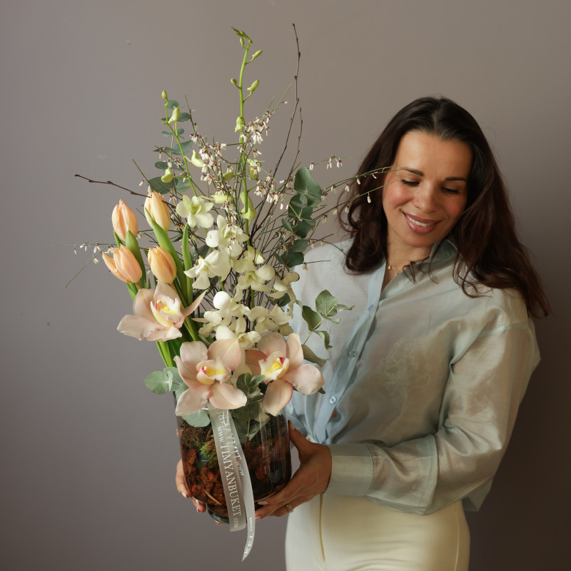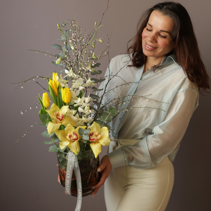 Изящная композиция с весенним настроением, где нарциссы и тюльпаны встречаются с утончённой орхидеей, а эвкалипт и гениста добавляют природной фактуры и воздуха. Высокий стеклянный цилиндр подчёркивает чистоту формы, а цветовую гамму можно выбрать — нежно-розовую или солнечно-жёлтую.