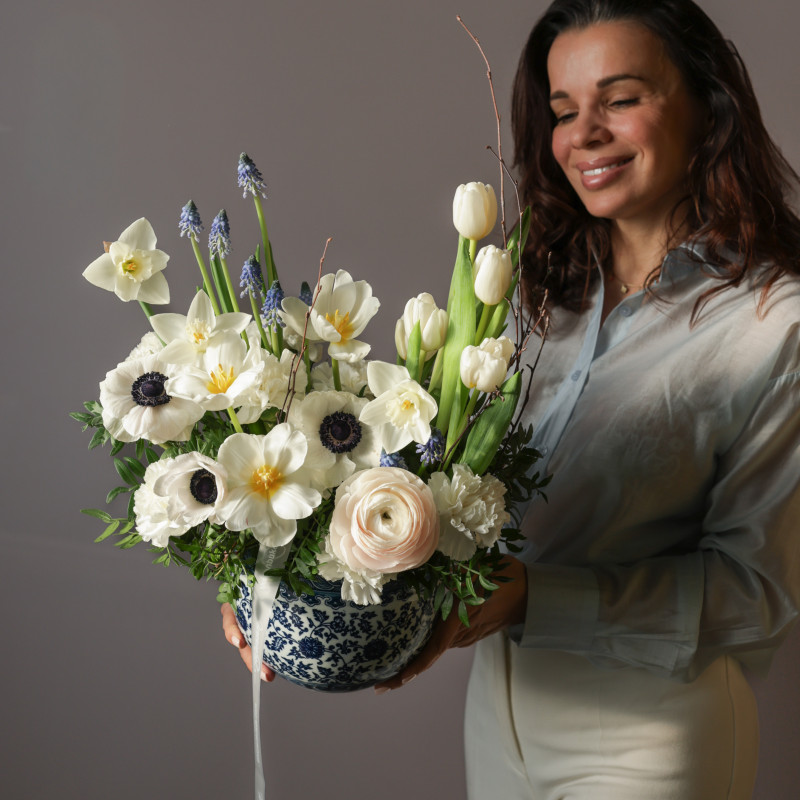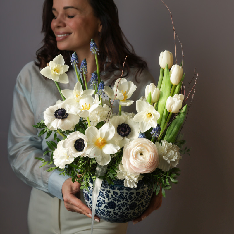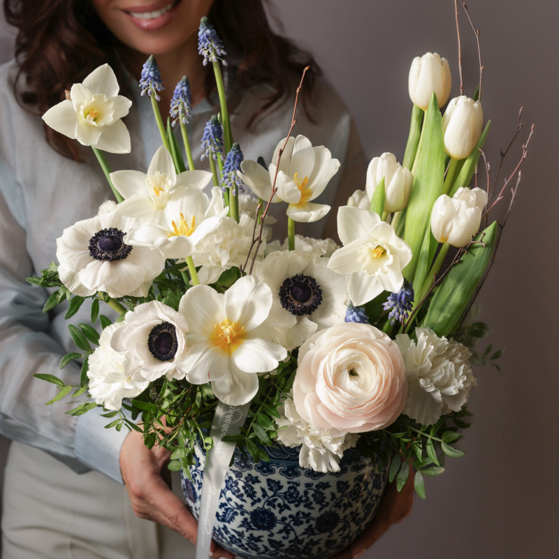 Нежная и свежая композиция в керамическом кашпо, где белые анемоны гармонично сочетаются с тюльпанами и ранункулюсами, а мускари и декоративная зелень добавляют воздушности и природной легкости. Этот букет наполнен весенним настроением и лёгкой элегантностью.