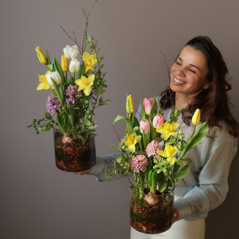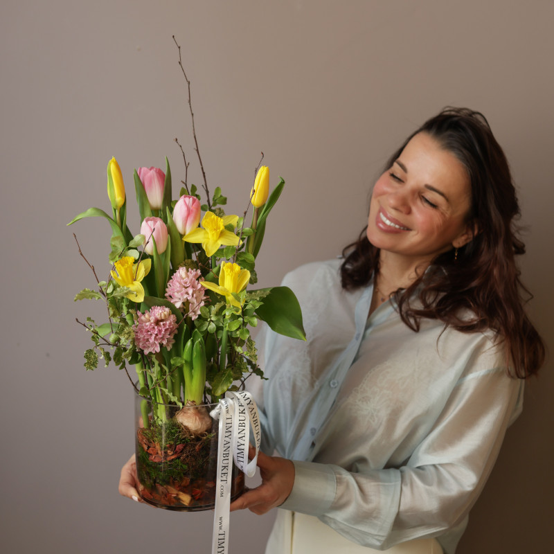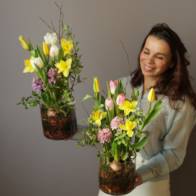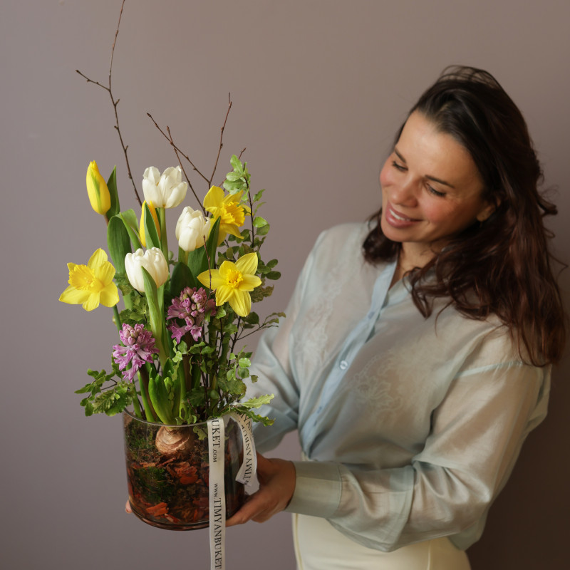 Живая весенняя композиция, наполненная светом и ароматами первых цветов сезона. Нарциссы, тюльпаны и гиацинты в сочетании с декоративной зеленью создают ощущение свежести и естественной лёгкости, подчёркнутое прозрачным высоким стеклянным цилиндром.