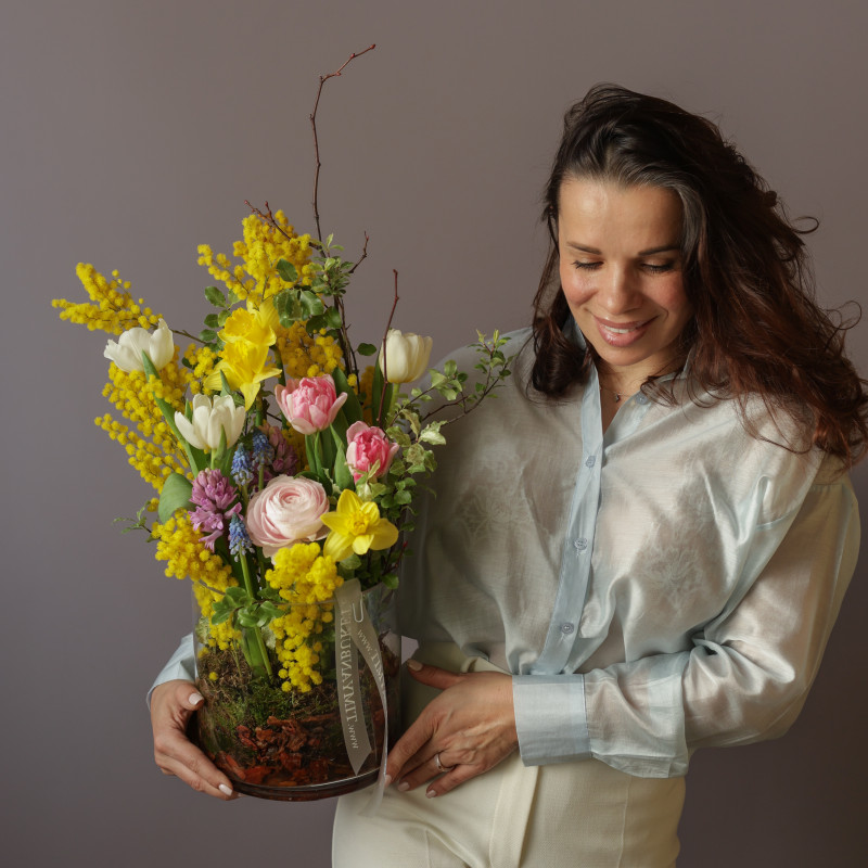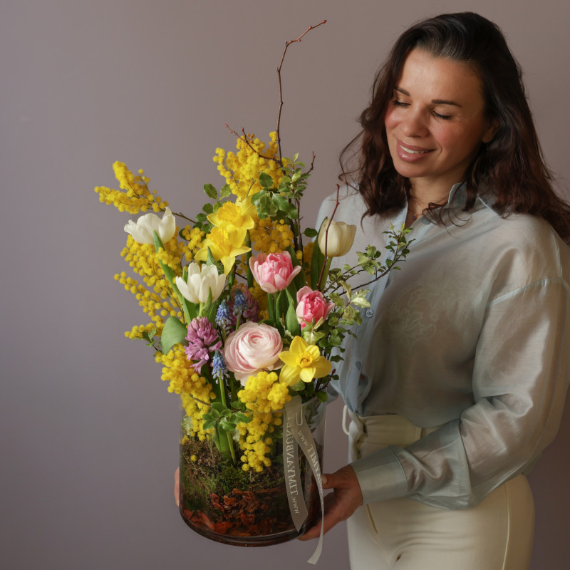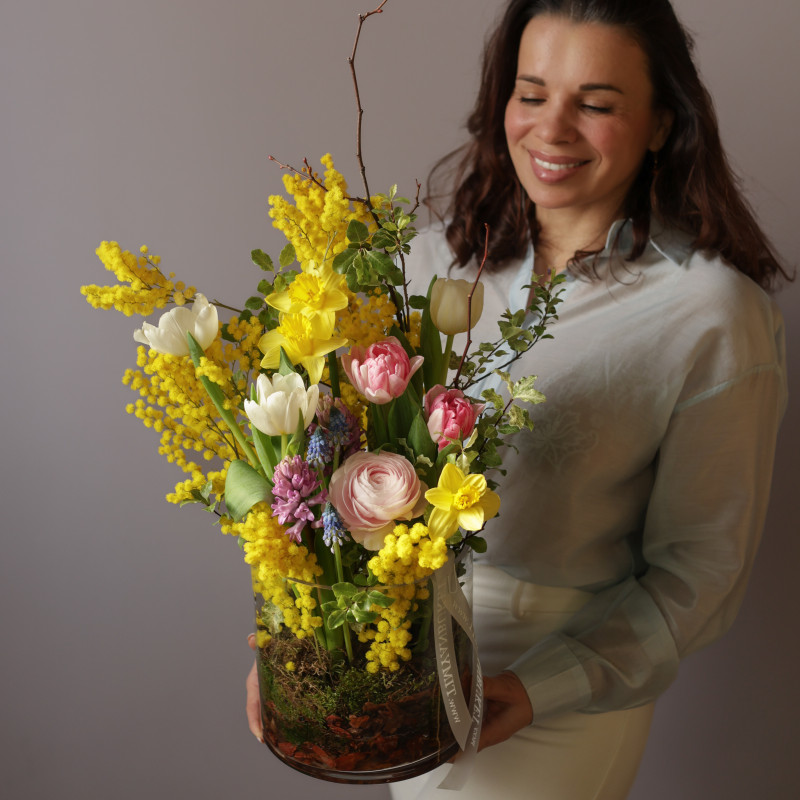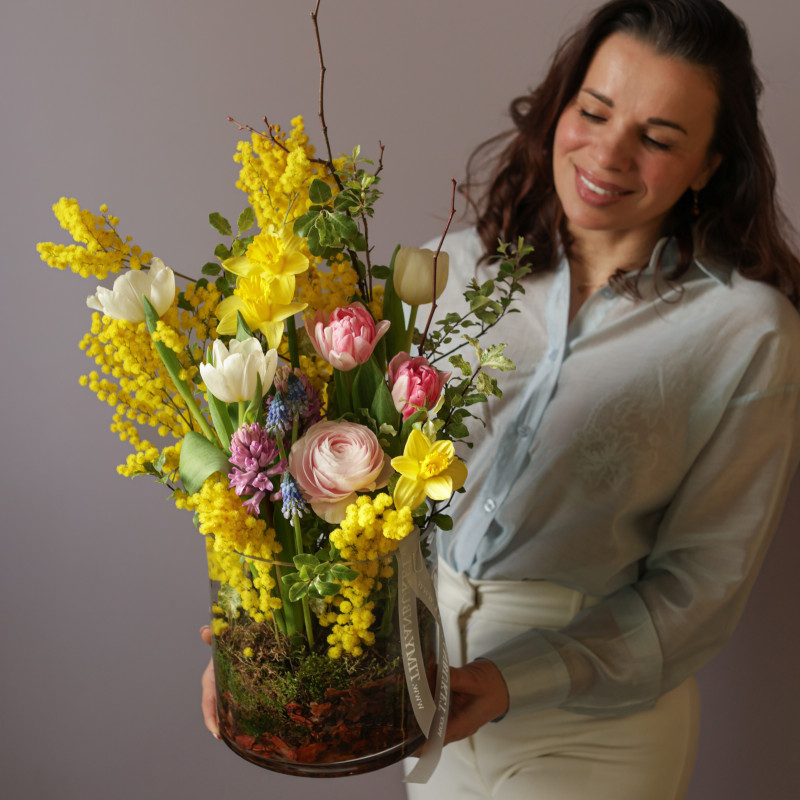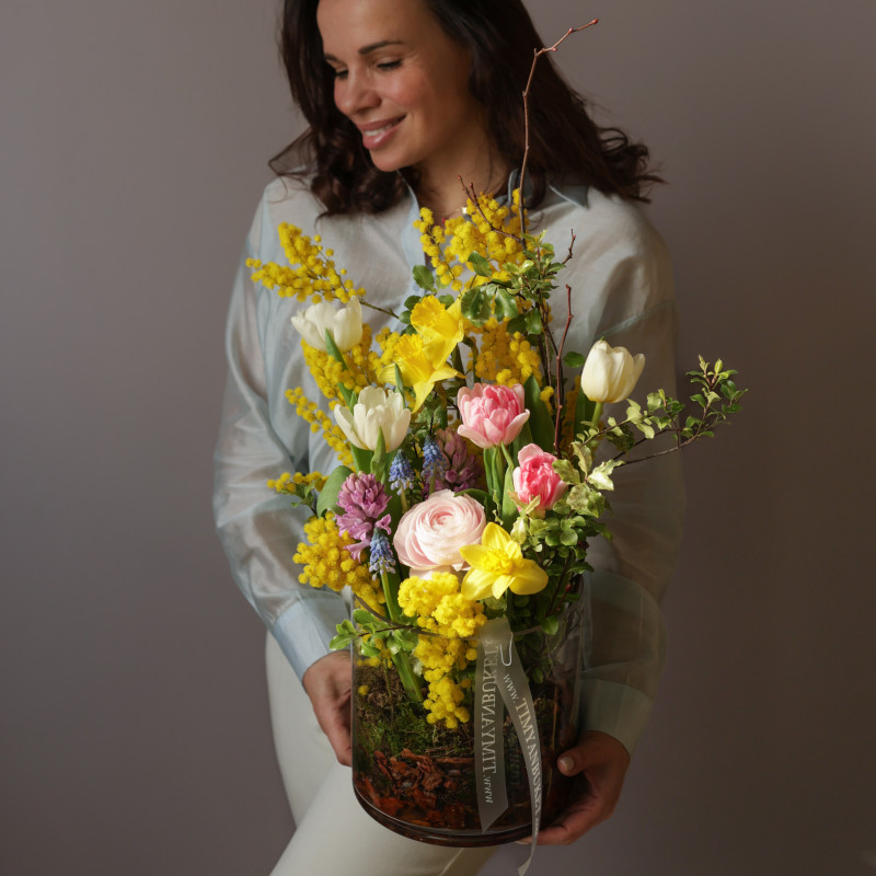 Яркая весенняя композиция, наполненная солнцем и ощущением пробуждения природы. Нарциссы, тюльпаны, мускари и ранункулюсы в сочетании с мимозой создают живой, эмоциональный образ, который особенно эффектно смотрится в прозрачном стеклянном цилиндре.