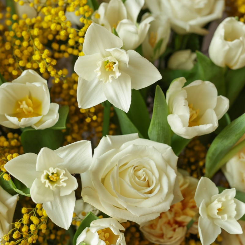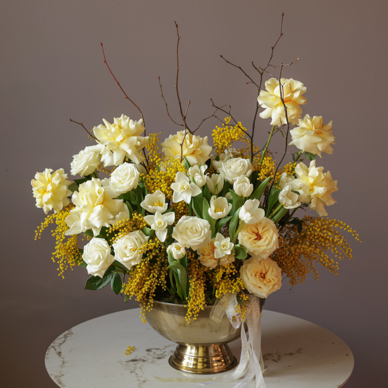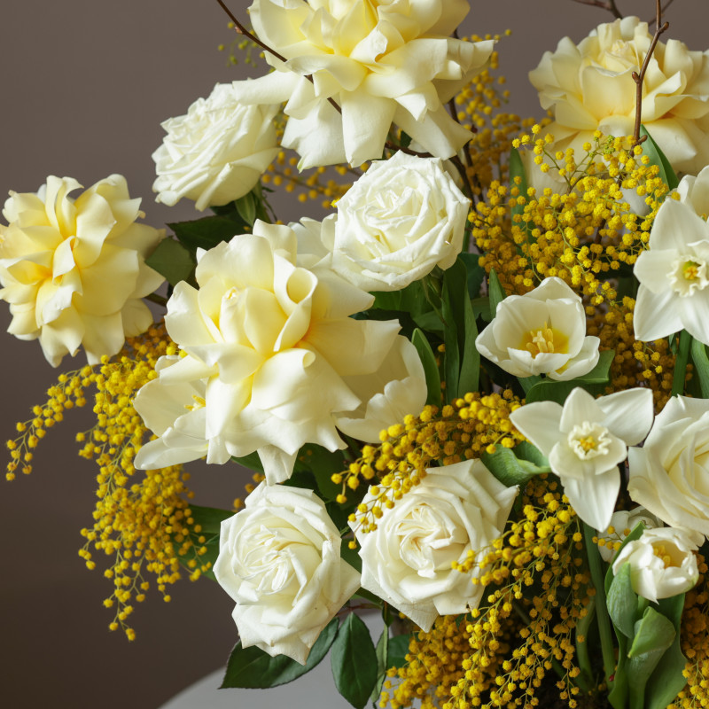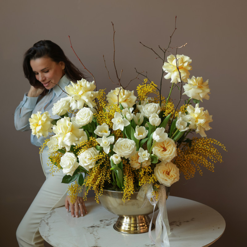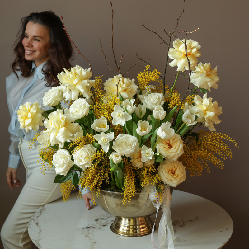 Объёмная «вау»-композиция в металлическом кашпо, где яркие тюльпаны гармонируют с белыми и кремовыми французскими розами, а пушистая мимоза добавляет солнечного настроения и лёгкой игривости. Букет наполнен весенней свежестью и утончённой элегантностью.