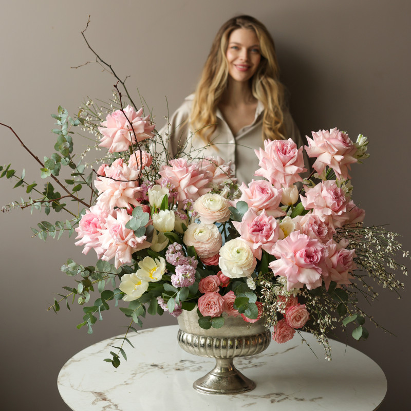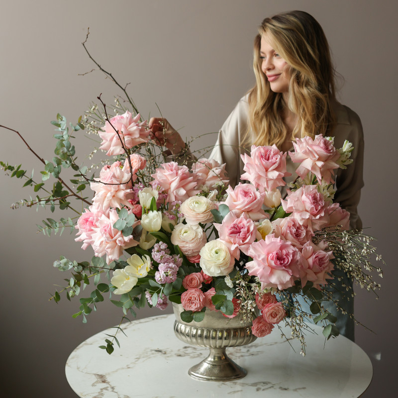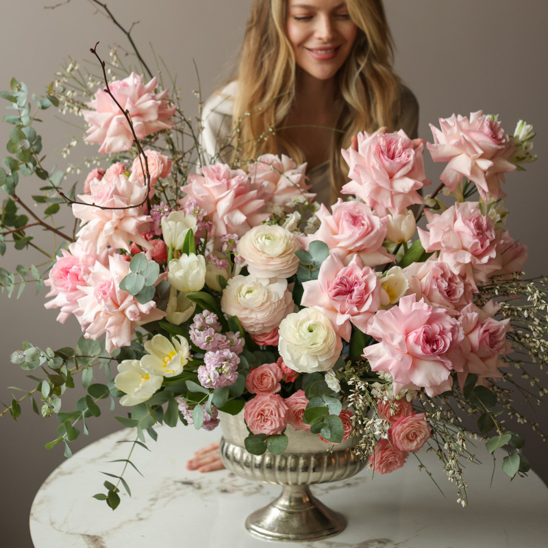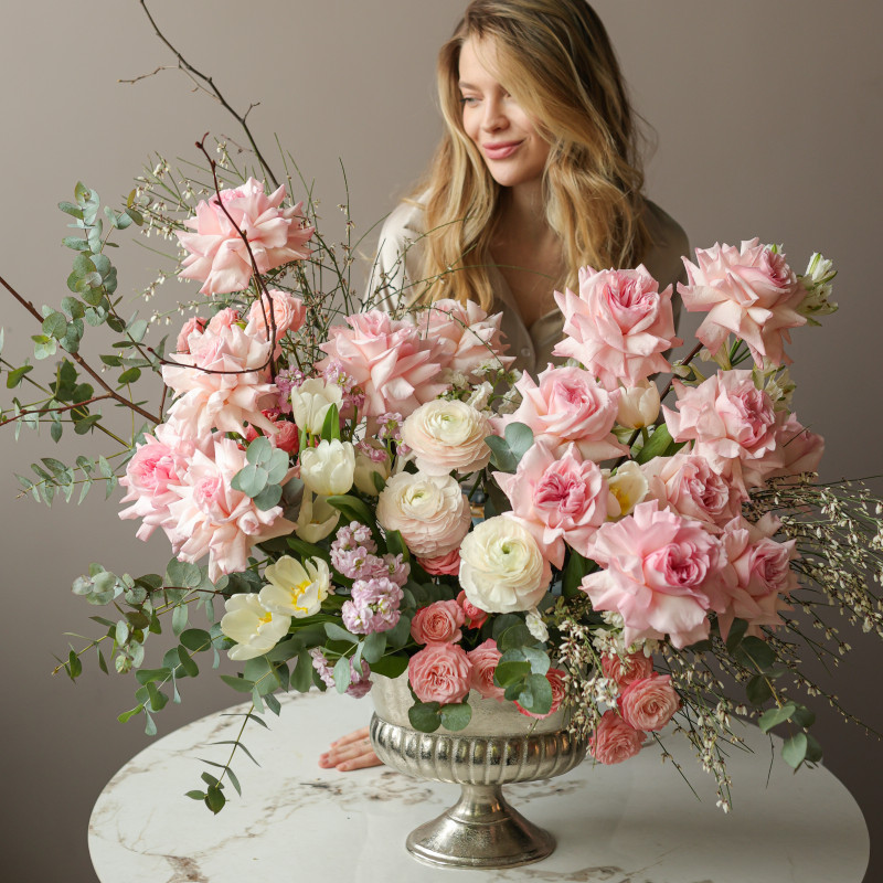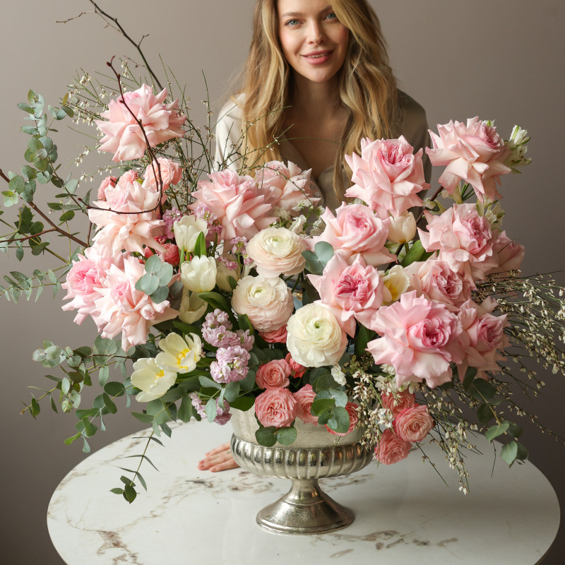 Премиум композиция с французскими розами, ранункулюсами эвкалиптом в вазоне-шампанница XL-75-80 см