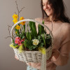 Цветущая авторская композиция из весенних грунтовых цветов в плетеной корзинке.