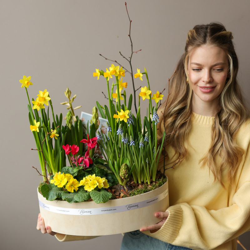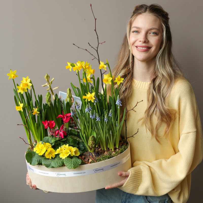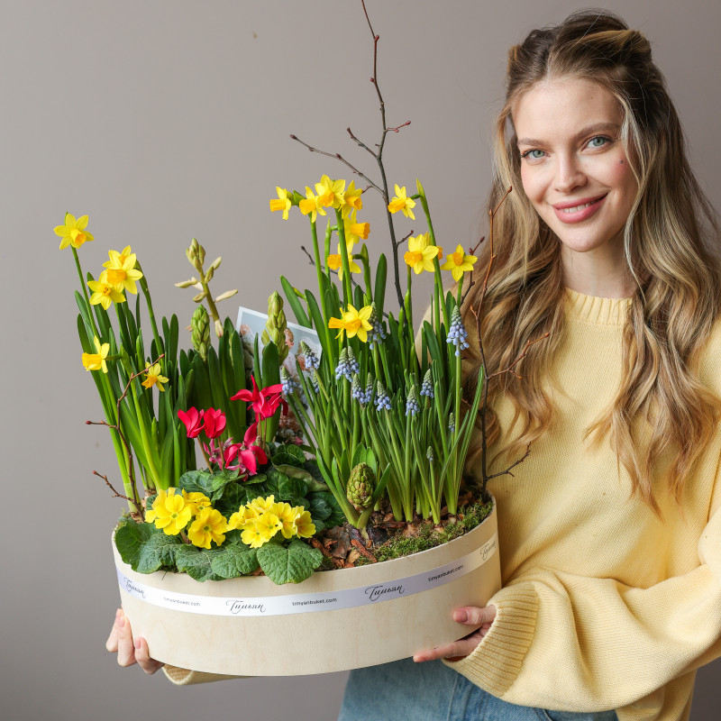 Весенний садик 40х30 см — шикарный уголок весны в деревянном круглом кашпо ручной работы с нарциссами, мускари, ароматными гиацинтами, примулой и цикламенами, дополненный декоративными веточками. Цветы раскрываются постепенно, наполняя пространство свежестью и тонким ароматом. Луковицы высажены в питательную почву из мха и древесной щепы, что обеспечивает яркое цветение около двух недель. После окончания цветения растения можно высадить в открытый грунт и продлить весеннее настроение.
