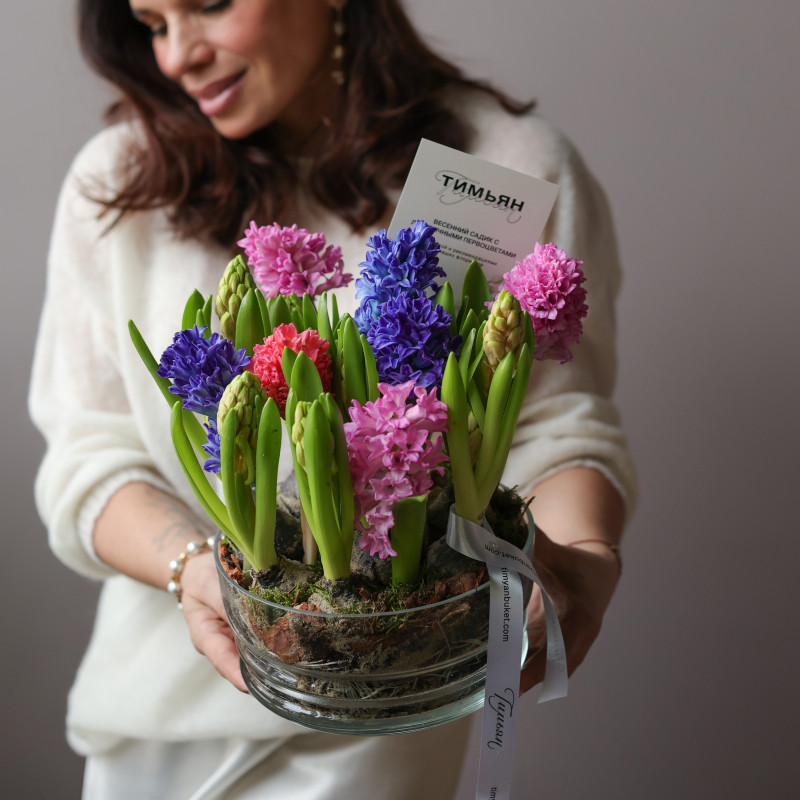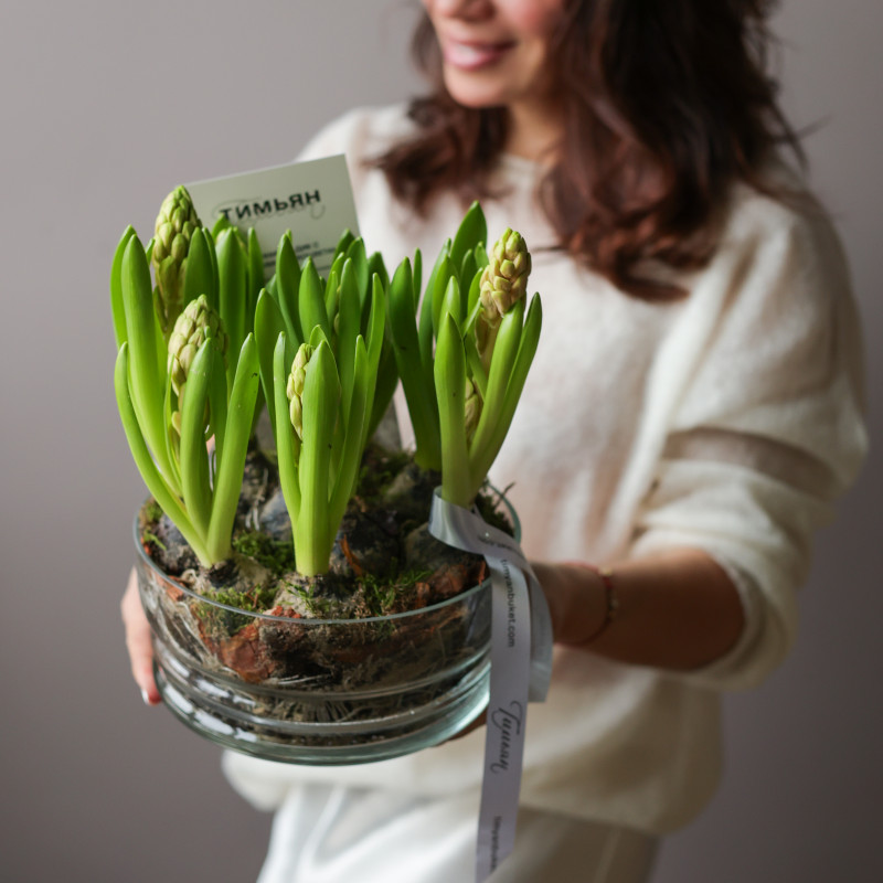 Луковицы высажены с использованием мха, который сохраняет аккуратный внешний вид и поддерживает оптимальную влажность.