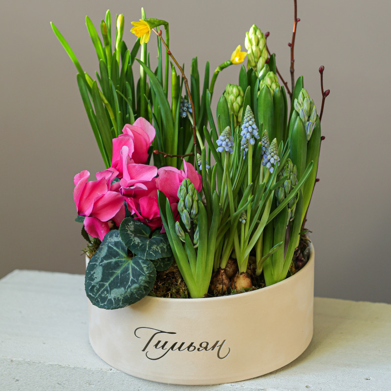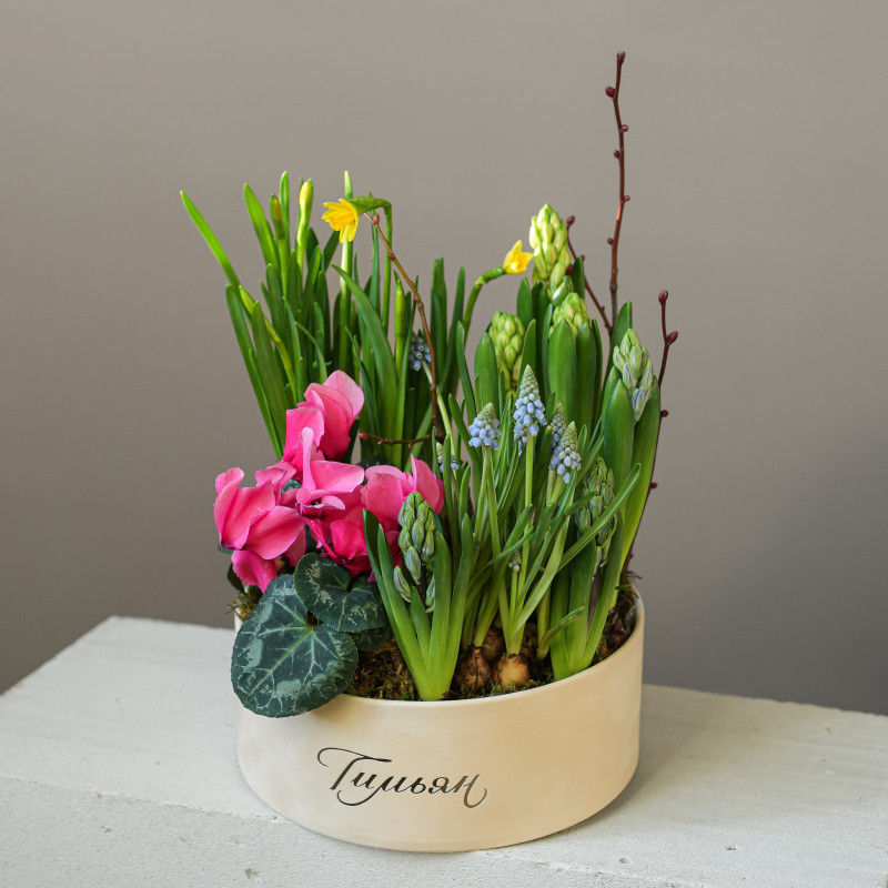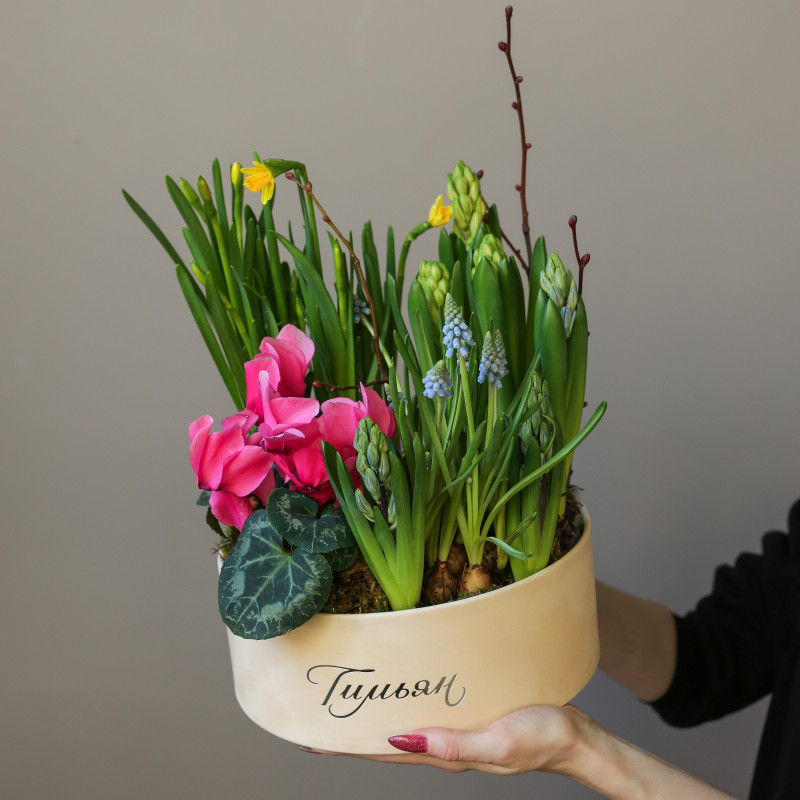 Весенний садик с нарциссами и цикламенами в круглой бархатной коробке — нарциссы, цикламены, гиацинты, мускари и декоративные веточки постепенно раскрывают свои цветы, создавая яркий и ароматный уголок весны прямо у вас дома. Луковицы высажены в питательную почву из мха и древесной щепы, что обеспечивает цветение около двух недель. После окончания цветения растения можно высадить в открытый грунт и продлить весеннее настроение.