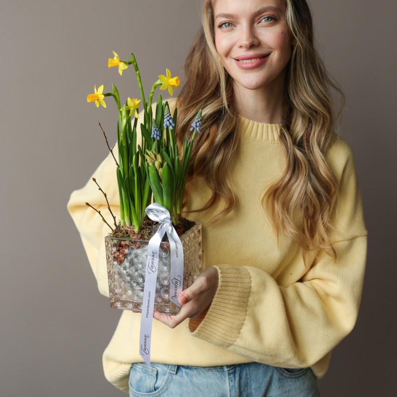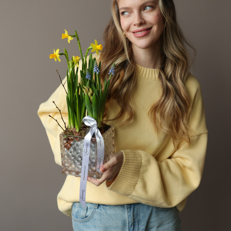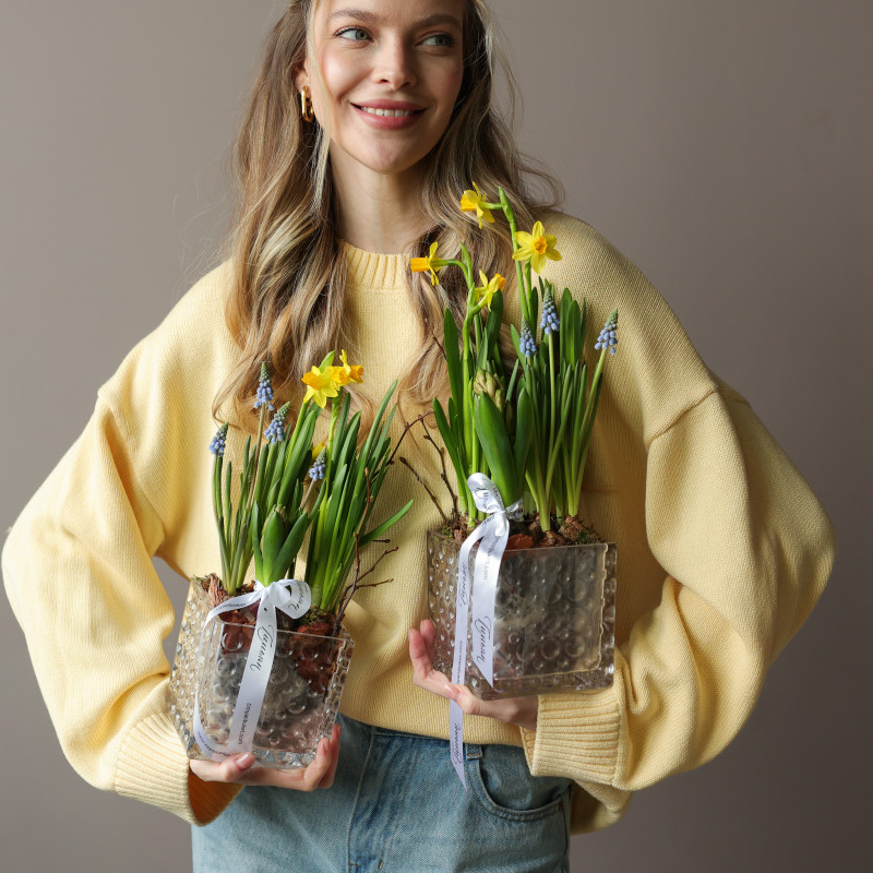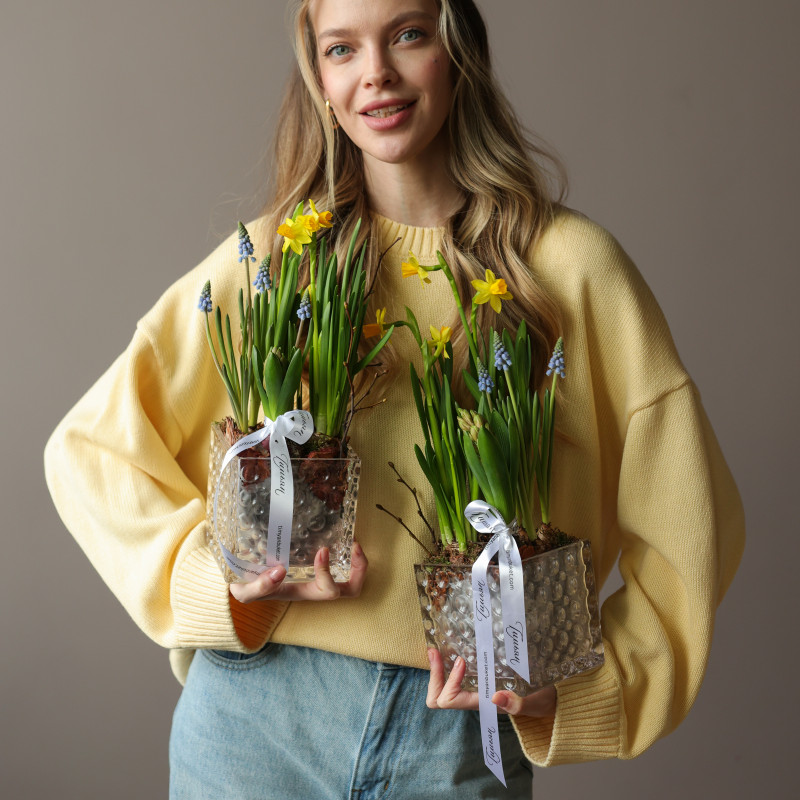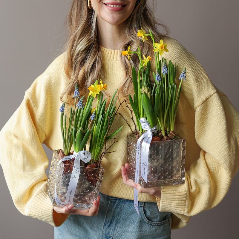 Весенний садик — маленький живой уголок весны, где нарциссы, ароматные гиацинты и мускари раскрываются постепенно, даря радость и свежие ароматы. Луковицы высажены в питательную почву из мха и древесной щепы, что помогает им активно развиваться и радовать цветением около двух недель. После окончания цветения растения можно высадить в открытый грунт и продлить весеннее настроение.