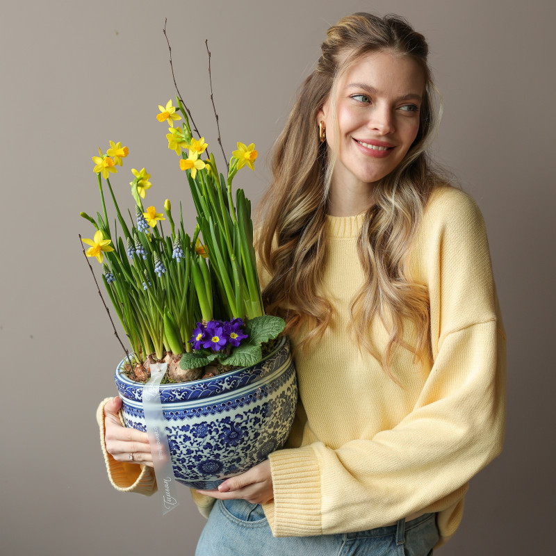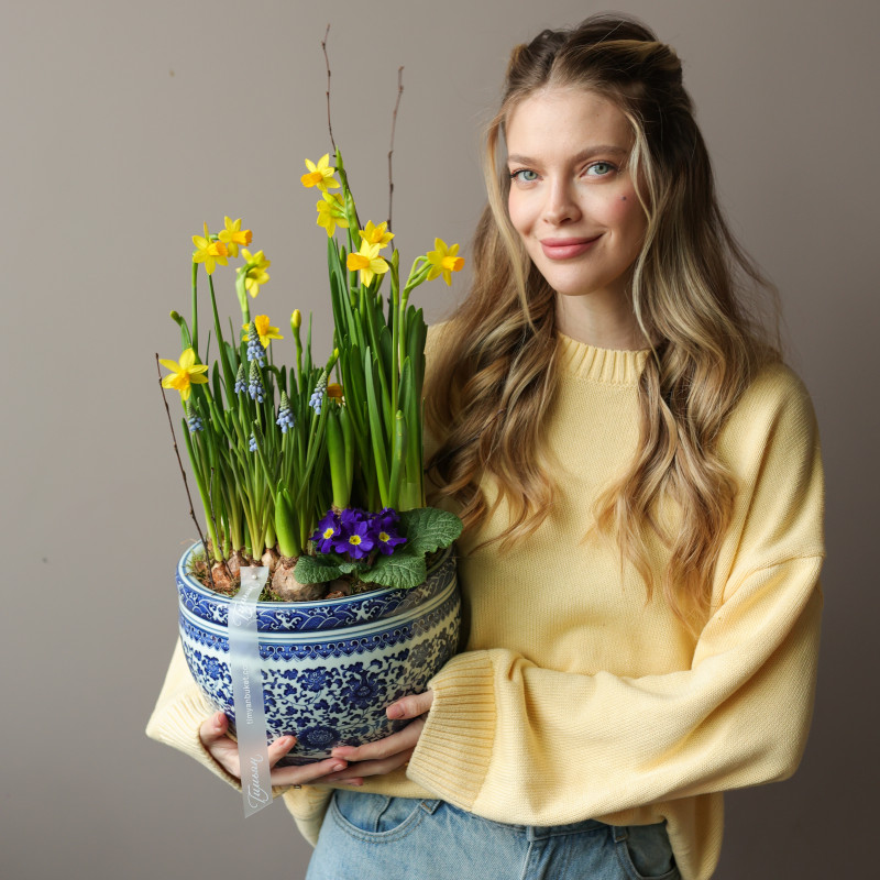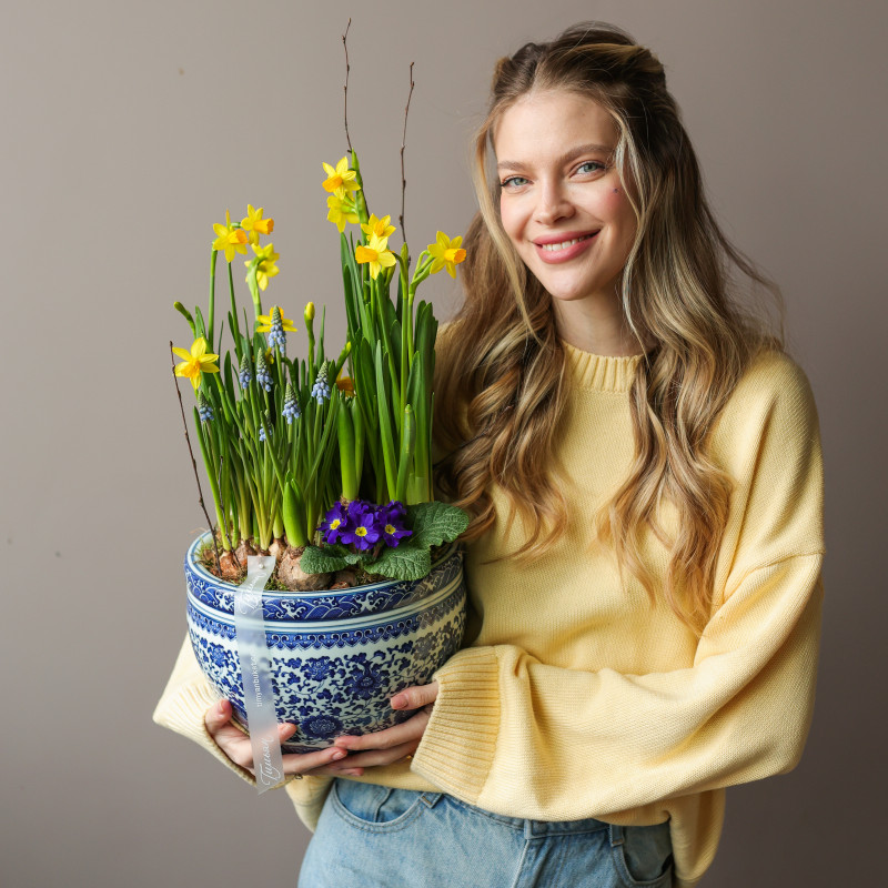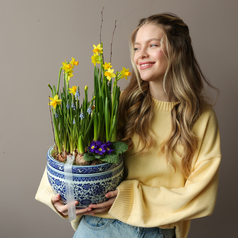 Весенний садик — маленький уголок весны с нарциссами, мускари, гиацинтами и примулой, который постепенно раскрывает свои цветы, наполняя дом свежестью и лёгким ароматом. Луковицы высажены в питательную почву из мха и древесной щепы, чтобы цветение радовало вас около двух недель. После окончания цветения растения можно высадить в открытый грунт и продлить весеннее настроение.