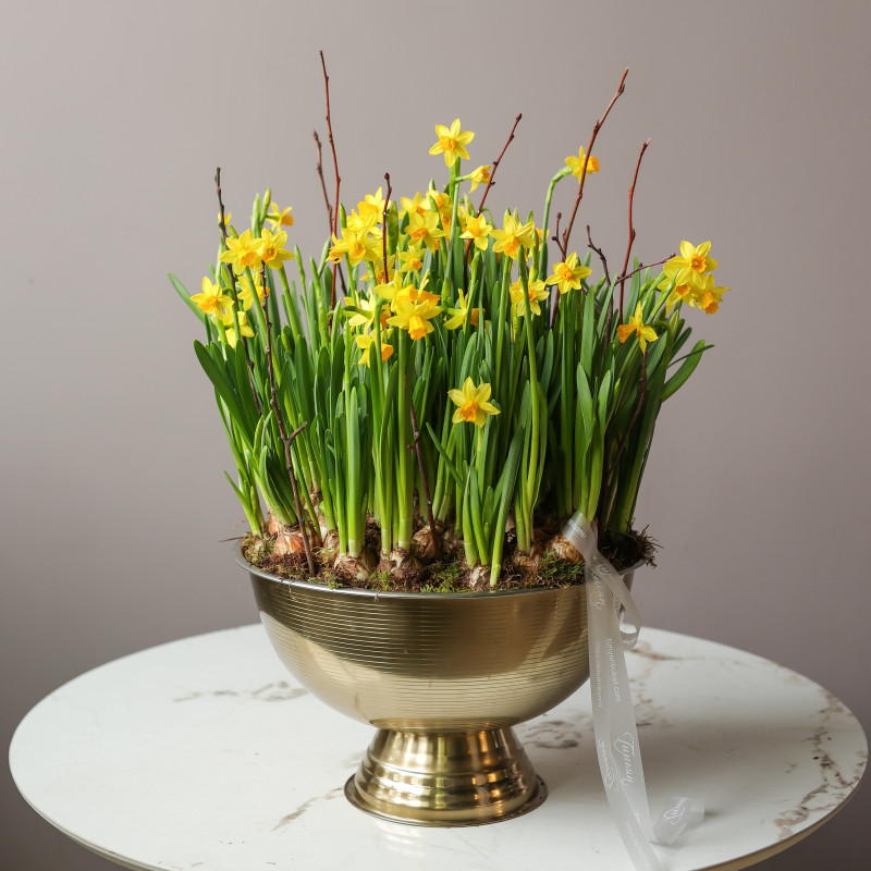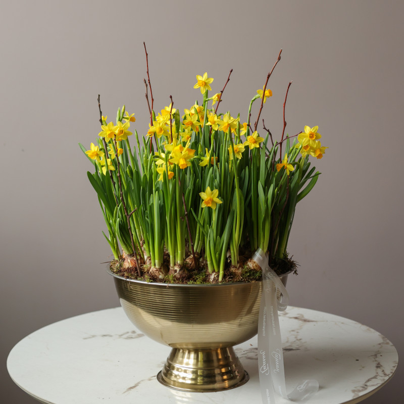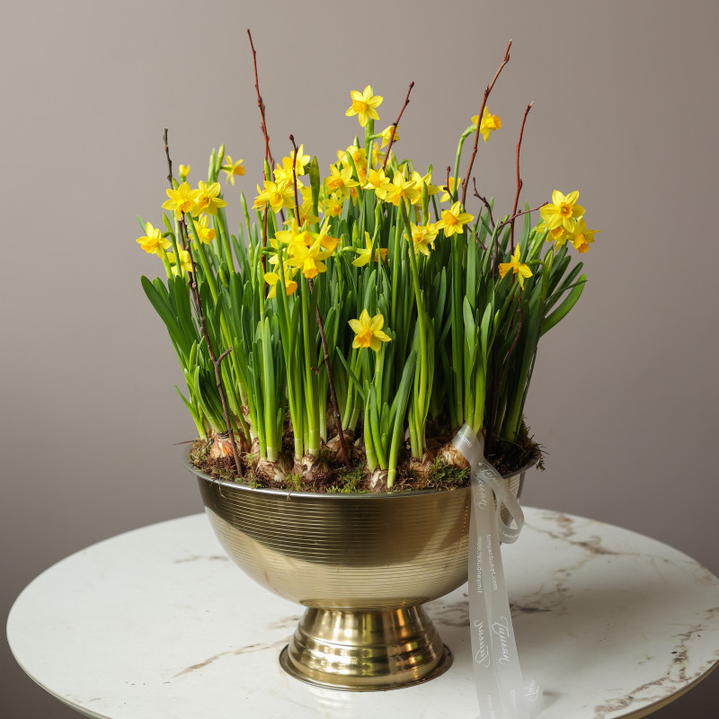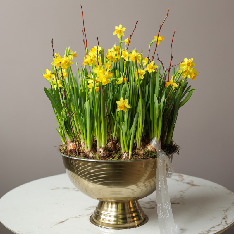 Стильный объёмный премиум весенний сад в шампаннице 40х60см — нарциссы с декоративными веточками постепенно раскрывают свои цветы, создавая яркий и ароматный уголок весны прямо у вас дома. Луковицы высажены в питательную почву из мха и древесной щепы, что обеспечивает цветение около двух недель. После окончания цветения растения можно высадить в открытый грунт и продлить весеннее настроение.