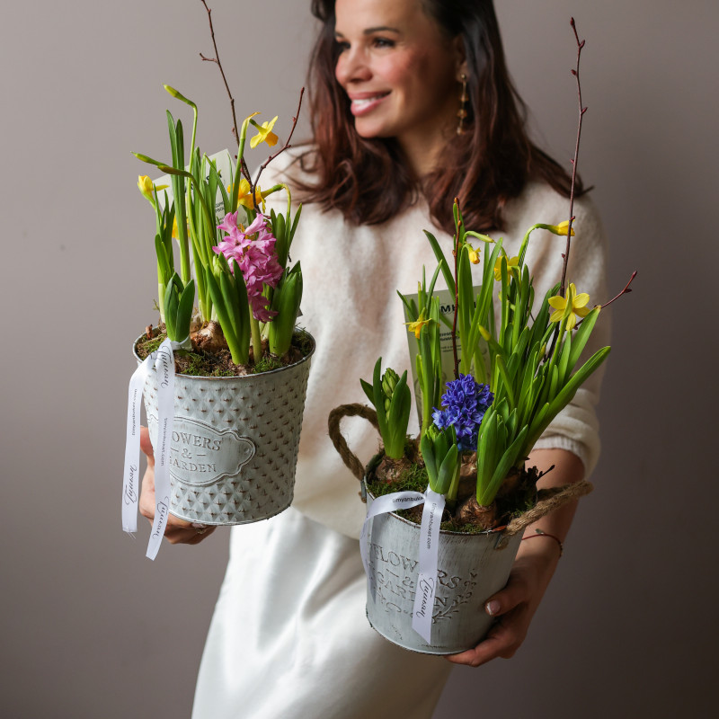 Мини-композиция из гиацинтов и нарцисса в металлическом ведерке с надписью — яркий и декоративный весенний акцент, состоящий из 3 гиацинтов и 1 нарцисса, дополненный веточками для объёма и текстуры. Металлическое ведерко с буквами добавляет оригинальности и стиля, идеально для подарка или интерьерного декора.