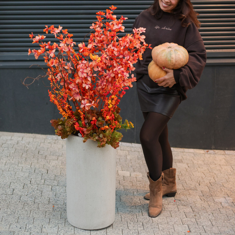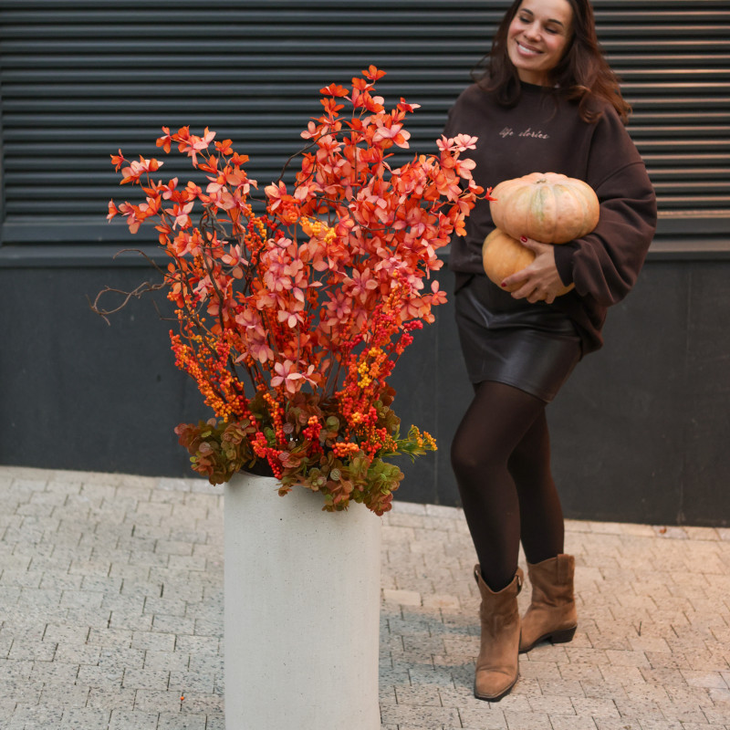Композиция с ягодами облепихи и высокими красными декоративными ветками в бетонном кашпо создаёт яркий, стильный и современный акцент, подчёркивая эстетику пространства.