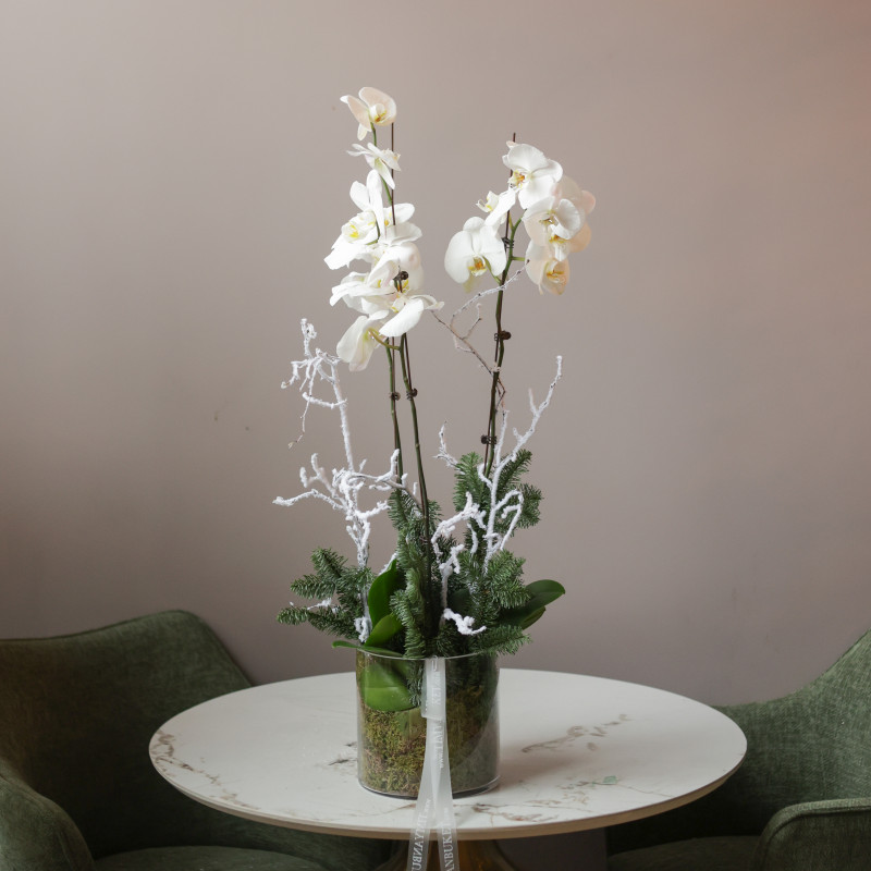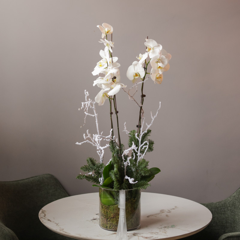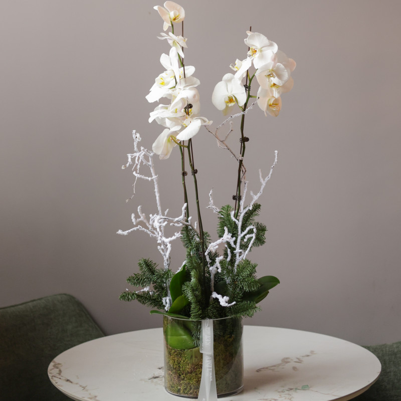 Белые орхидеи с хвоей в стеклянном цилиндре